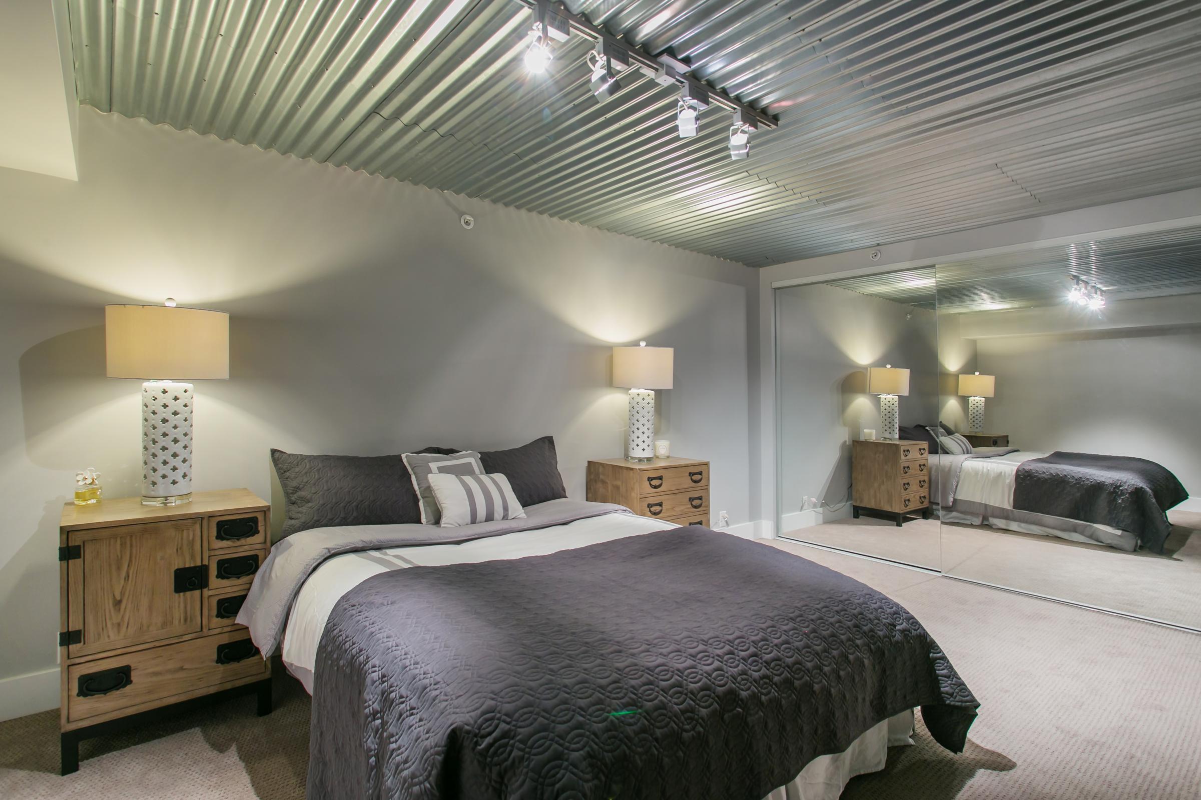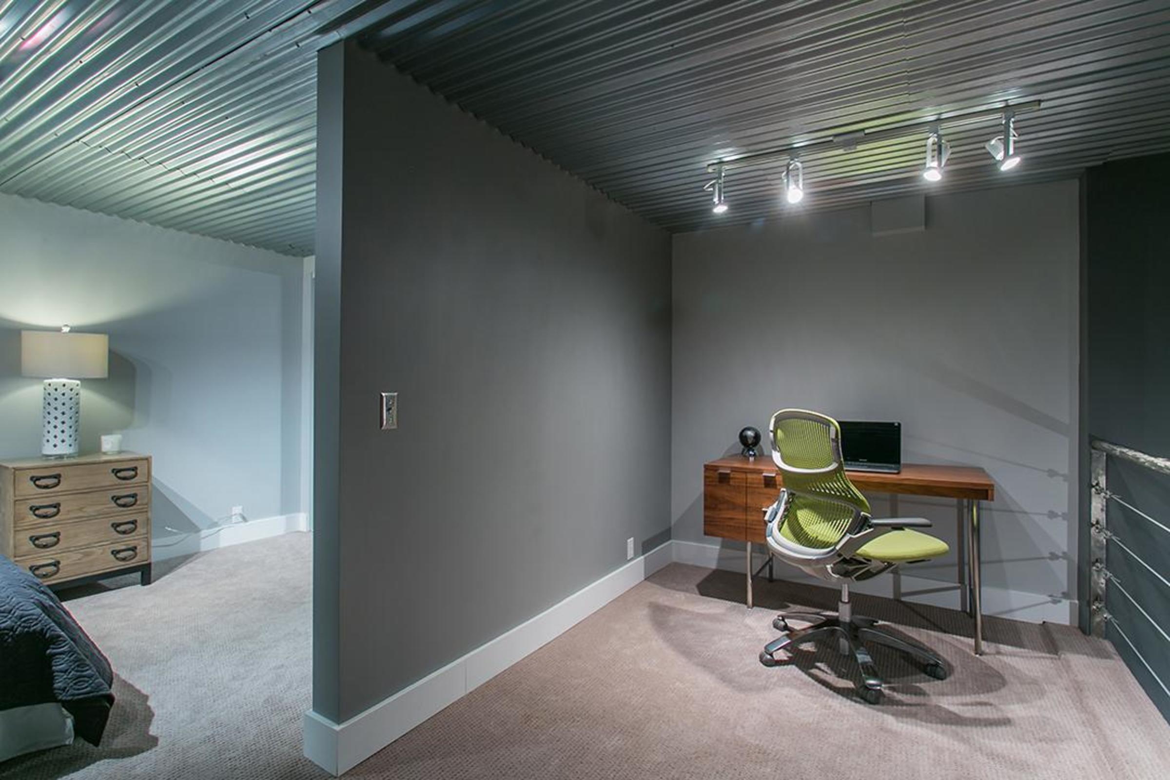 The functional design maximizes the living area both indoor and out: The loft is one of only eight with a 157-sq-ft outdoor patio flowing onto a 2,000 sq-ft common deck. Upstairs, you’ll find an oversized bedroom and den with a custom-brushed steel railing that complements the industrial corrugated-steel ceiling.