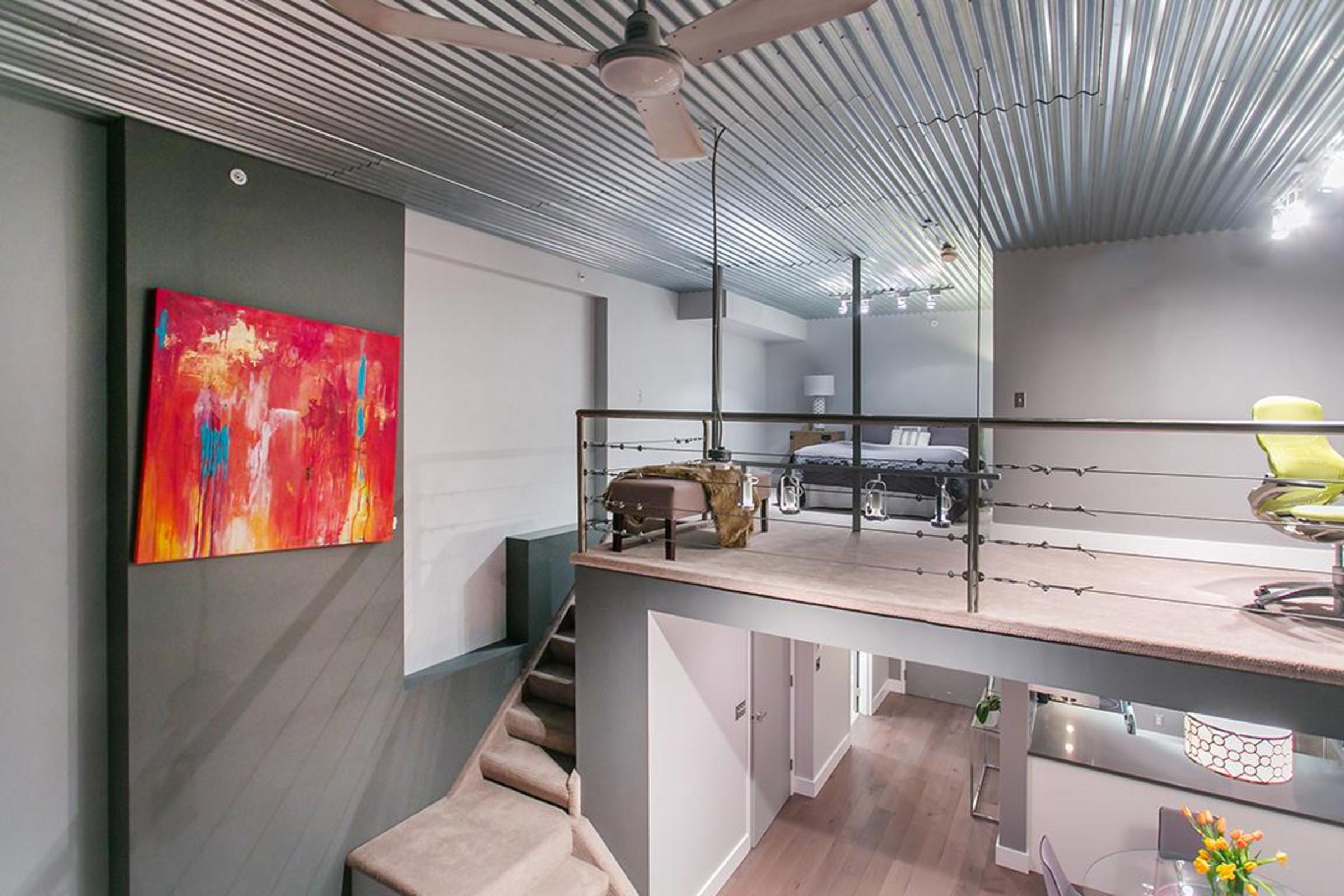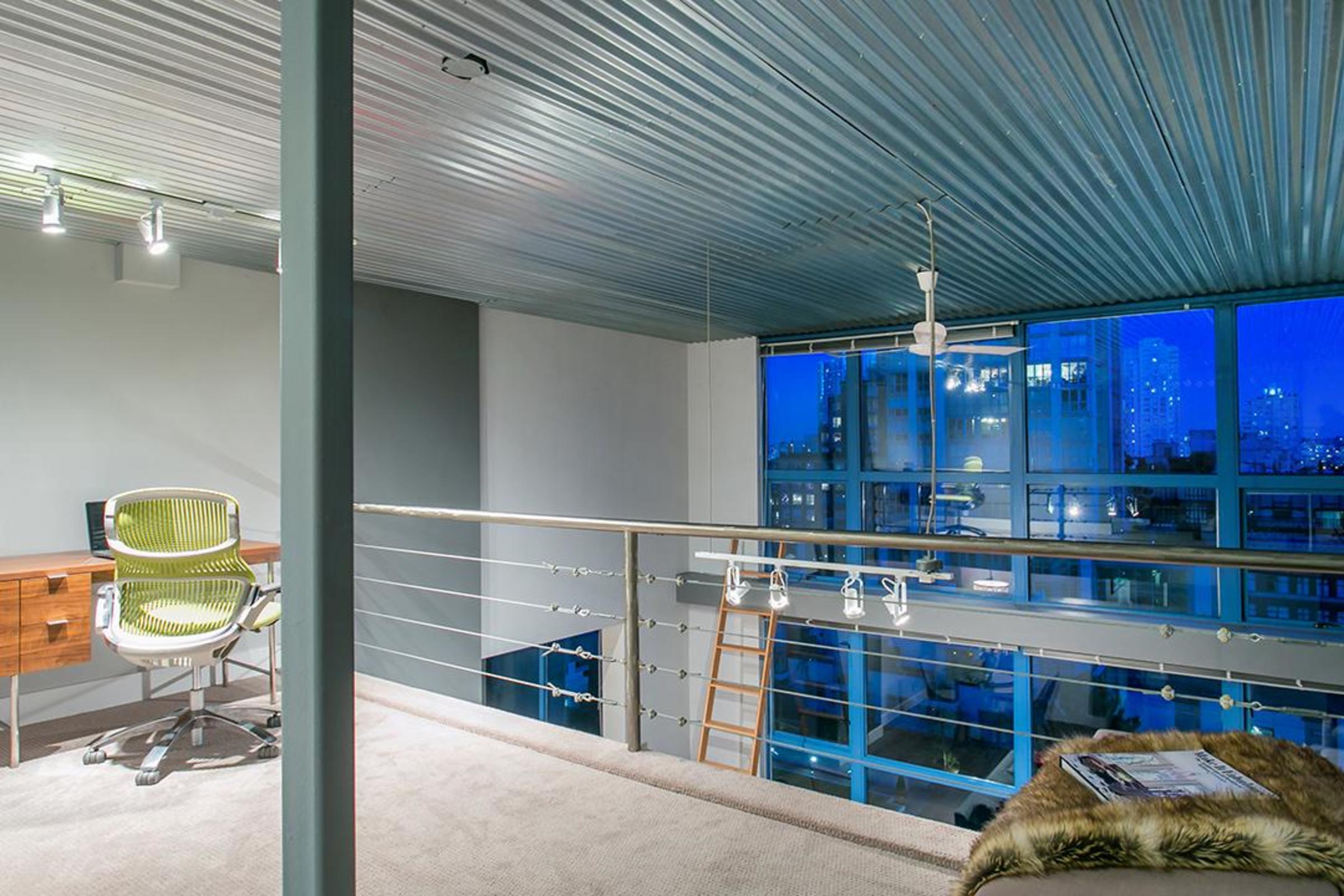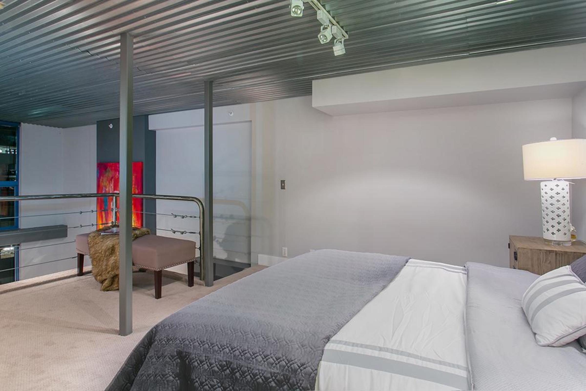 The functional design maximizes the living area both indoor and out: The loft is one of only eight with a 157-sq-ft outdoor patio flowing onto a 2,000 sq-ft common deck. Upstairs, you’ll find an oversized bedroom and den with a custom-brushed steel railing that complements the industrial corrugated-steel ceiling.