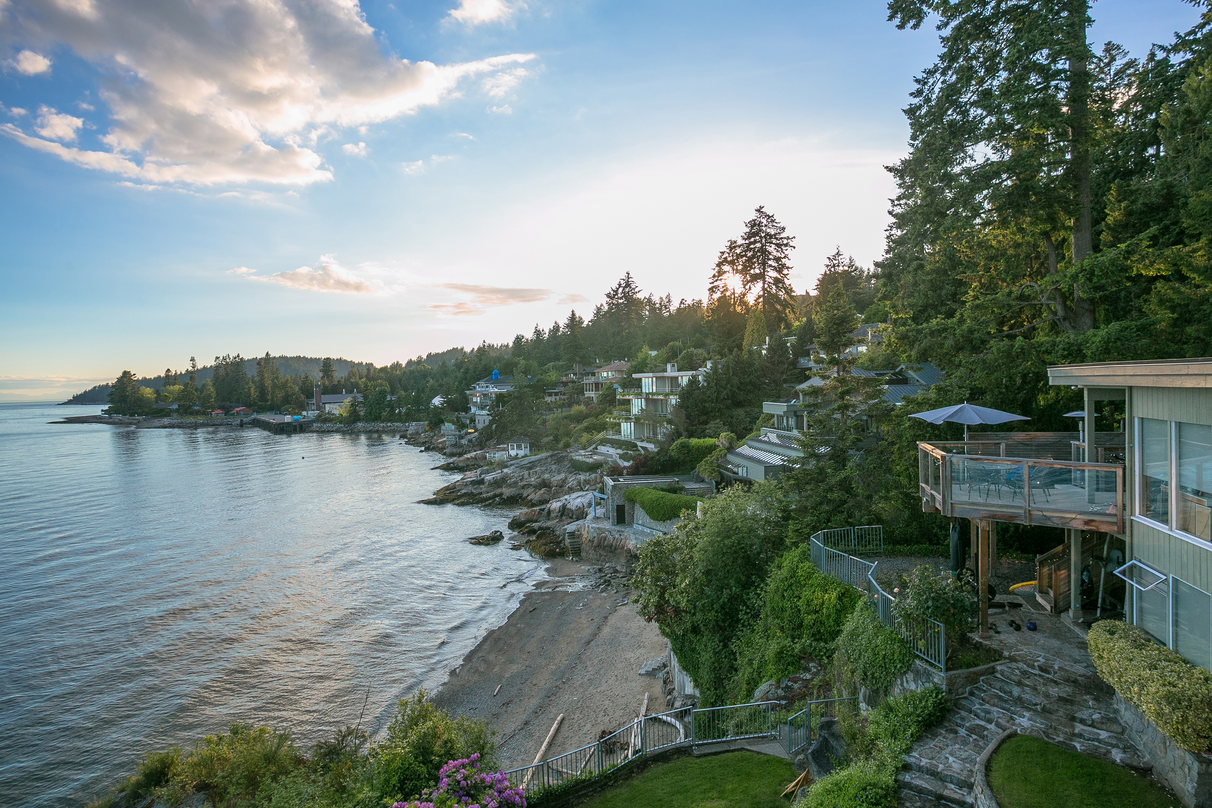 A magnificent Award Winning Residence by Master Architect Brian Hemingway. Situated high on a spectacular waterfront bluff overlooking a beautiful Sandy Beach & breathtaking Westerly Views to Vancouver Island. This sensational home features a dramatic open plan with high ceilings & wrap around floor to ceiling glass on all levels. Extensive interior detail in stone & exotic woods create a World Class Residence at a very reasonable price level. The house seems to carefully step down a hill leading to the ocean & beach below. The entire 120 ft. length of the residence overlooks the private estate & wonderful views. A large master bedroom suite enjoys a private view side terrace, large walk-in dressing room and stunning ensuite bathroom. This outstanding 6 bedroom home has been featured in many publications including Western Living Magazine & is on the top B.C. 50 List of the most beautiful residential homes in British Columbia. This is without a doubt a trophy property that