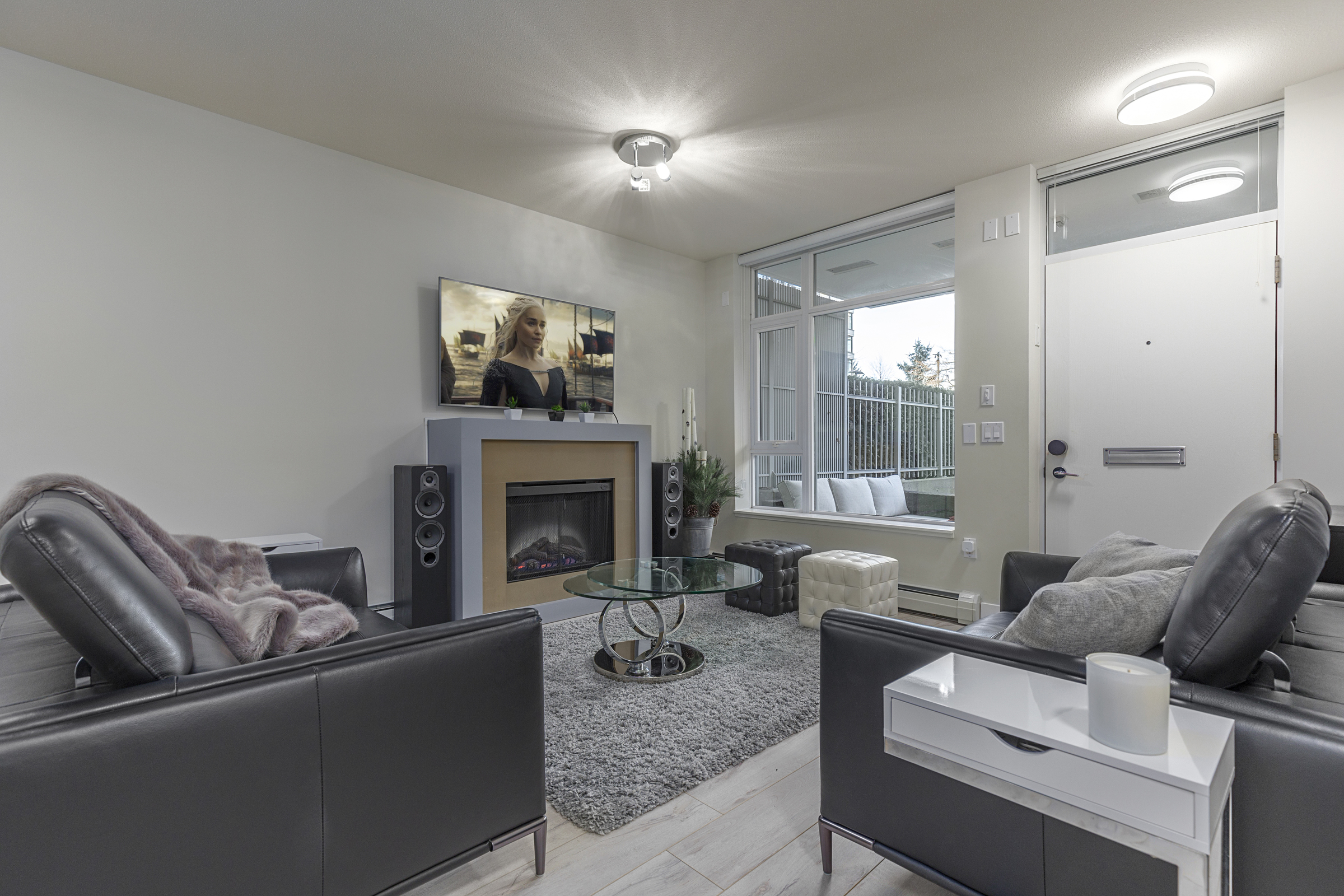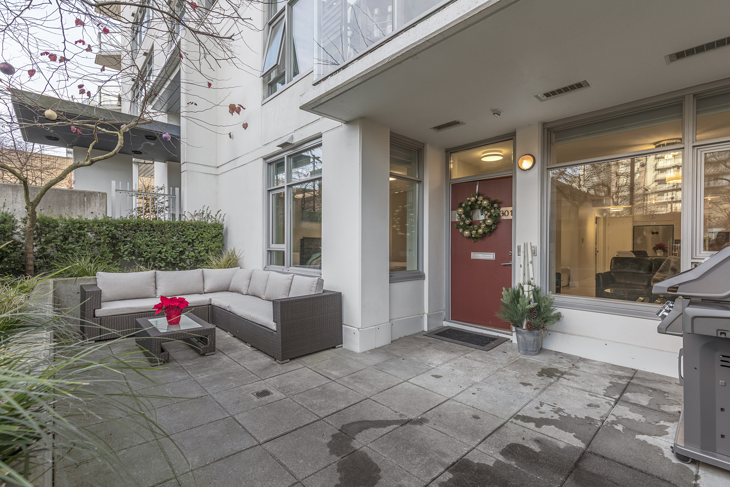 This beautifully renovated extra large 1 bed and den corner townhome has it's own gated entrance and oversized 365 sqft patio area overlooking the
