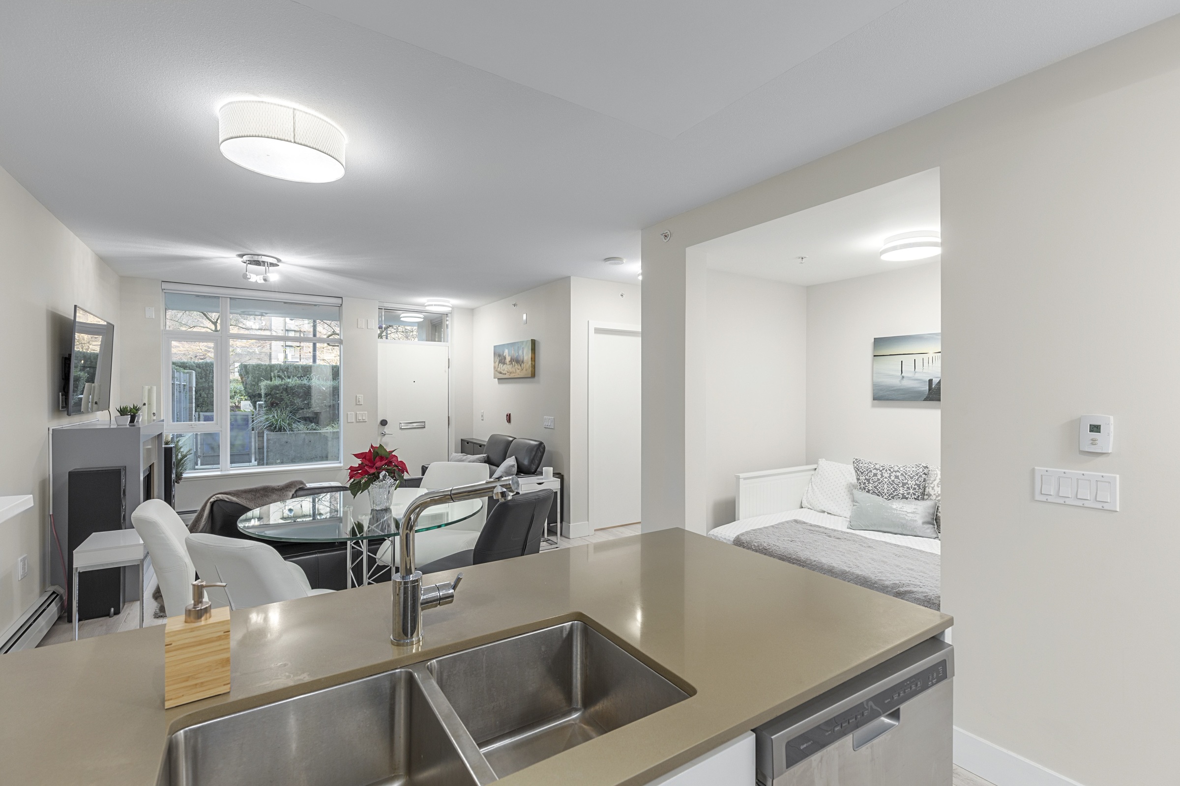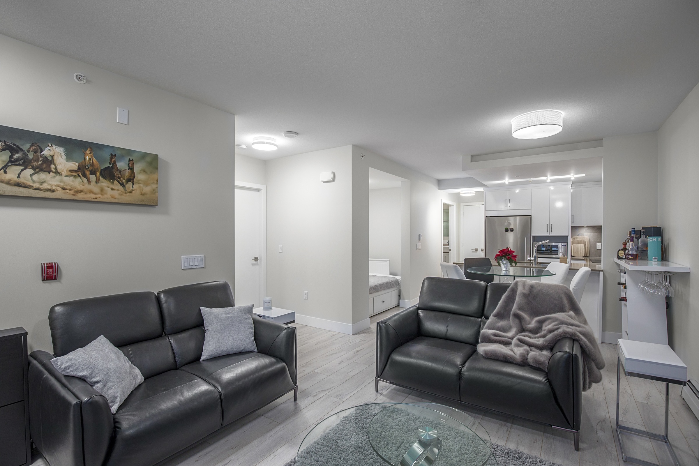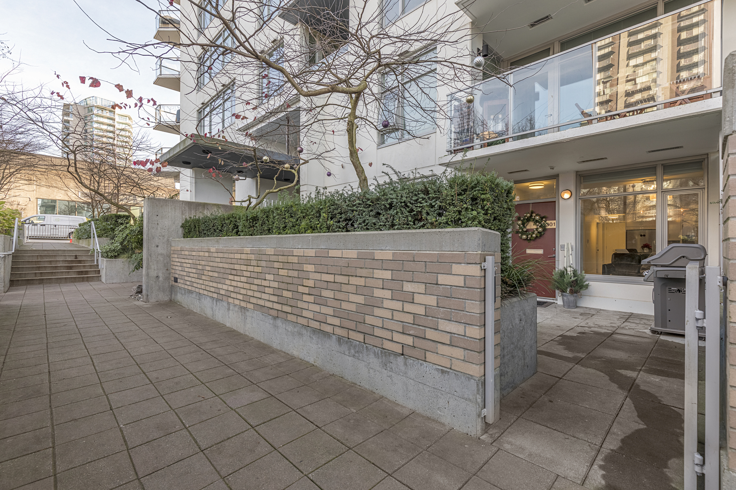This beautifully renovated extra large 1 bed and den corner townhome has it's own gated entrance and oversized 365 sqft patio area overlooking the