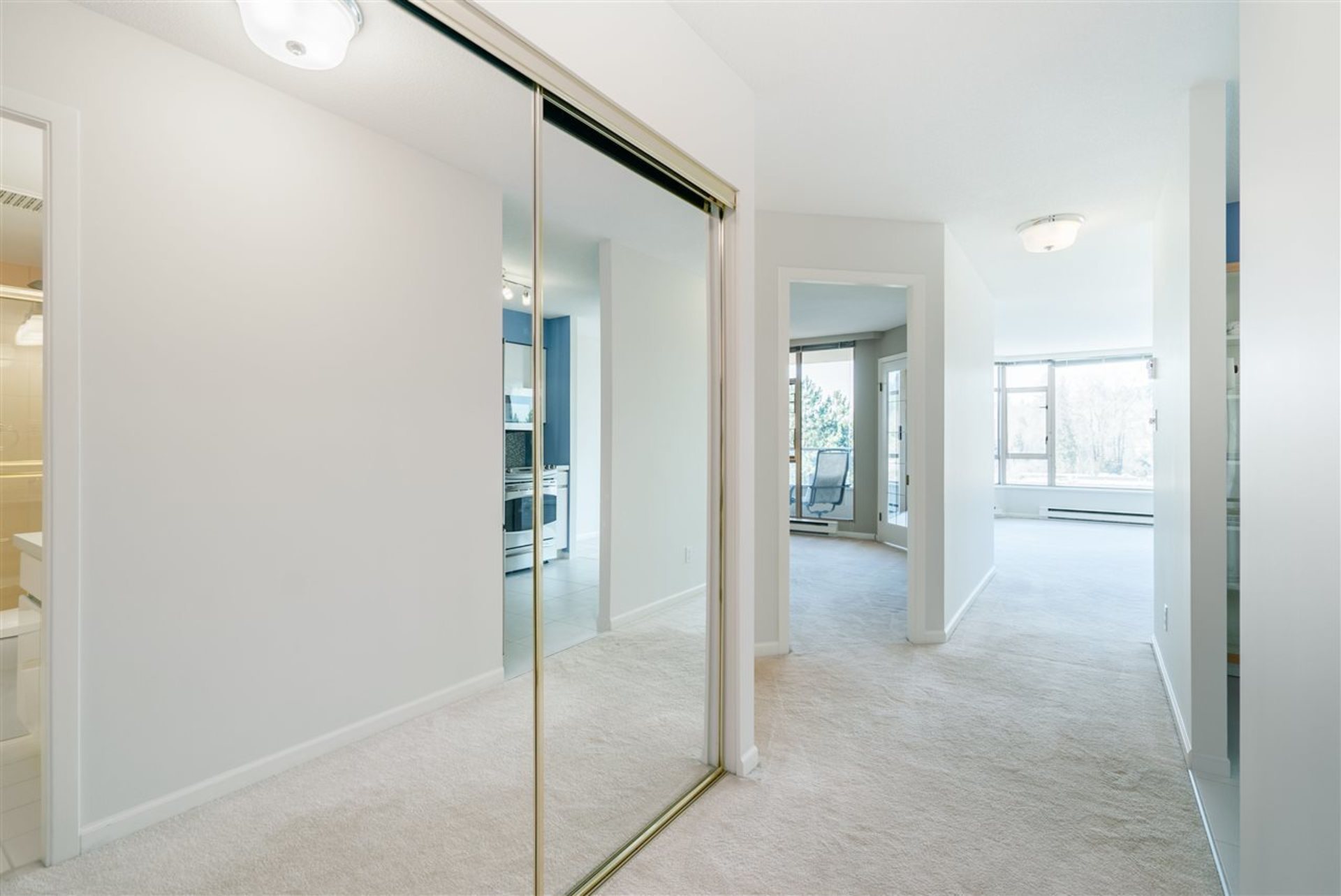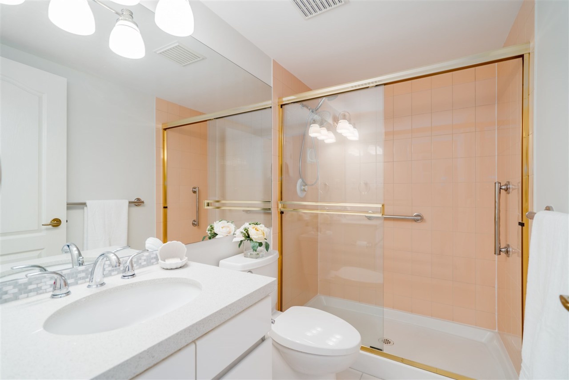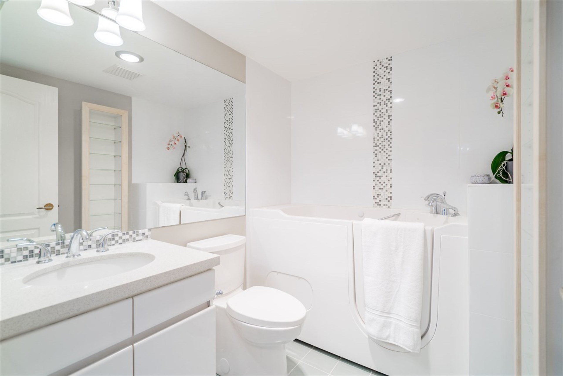 The Carleton at the Club - this elite, private residence for mature 50+ owners has resort style amenities that will tempt you to never leave home! From the private theatre, library and billiards room to the pool, hot tub and impeccably landscaped gardens, this exquisite property is guaranteed to enhance your lifestyle! This bright, west facing, oversized 1001 sqft., 2BR, 2 BA home boasts beautiful views of Grouse Mtn. and the tree-lined horizon. The large private deck is a natural extension of the living space, complementing the large light filled open living and dining area. Recent renovations include a newly updated kitchen with brand new quartz counters, backsplash, stainless steel fridge, stove, dishwasher and microwave. The large walk-in closet, step-in soaker bathtub, in-suite laundry are just a few of the features that make this home a stand-out. Walking distance to Park & Tilford shopping centre, parks, trails, and Capilano river. Wheelchair