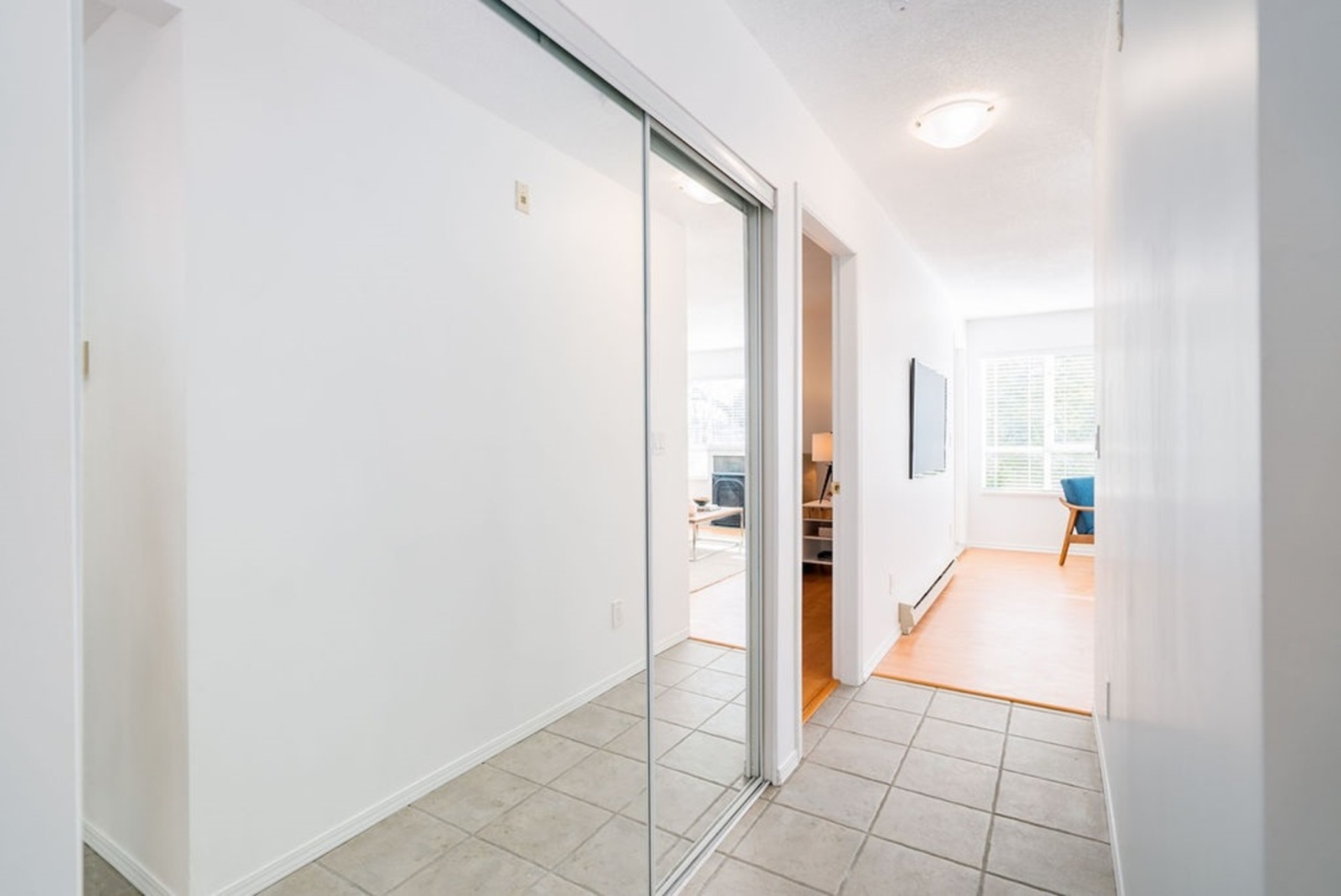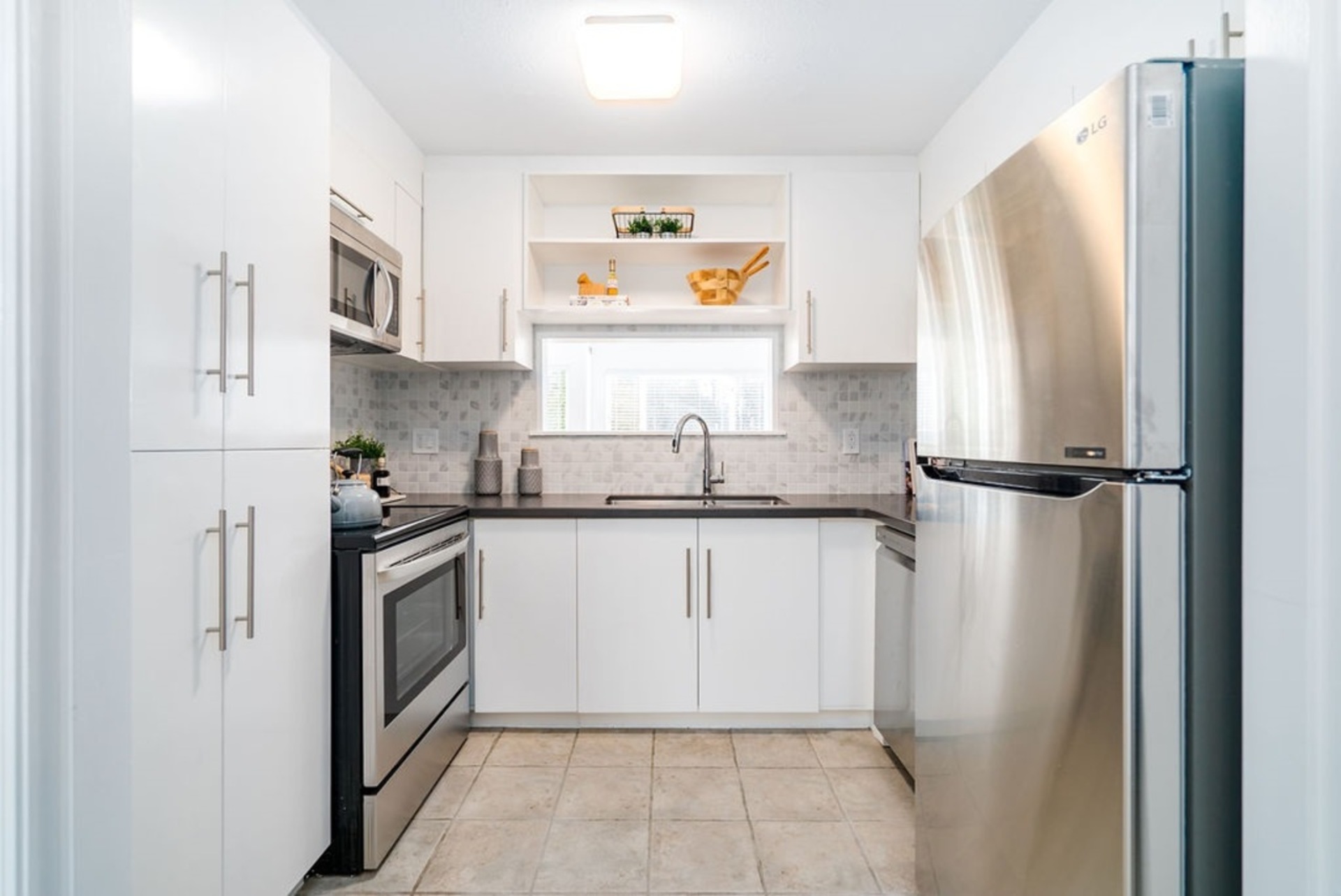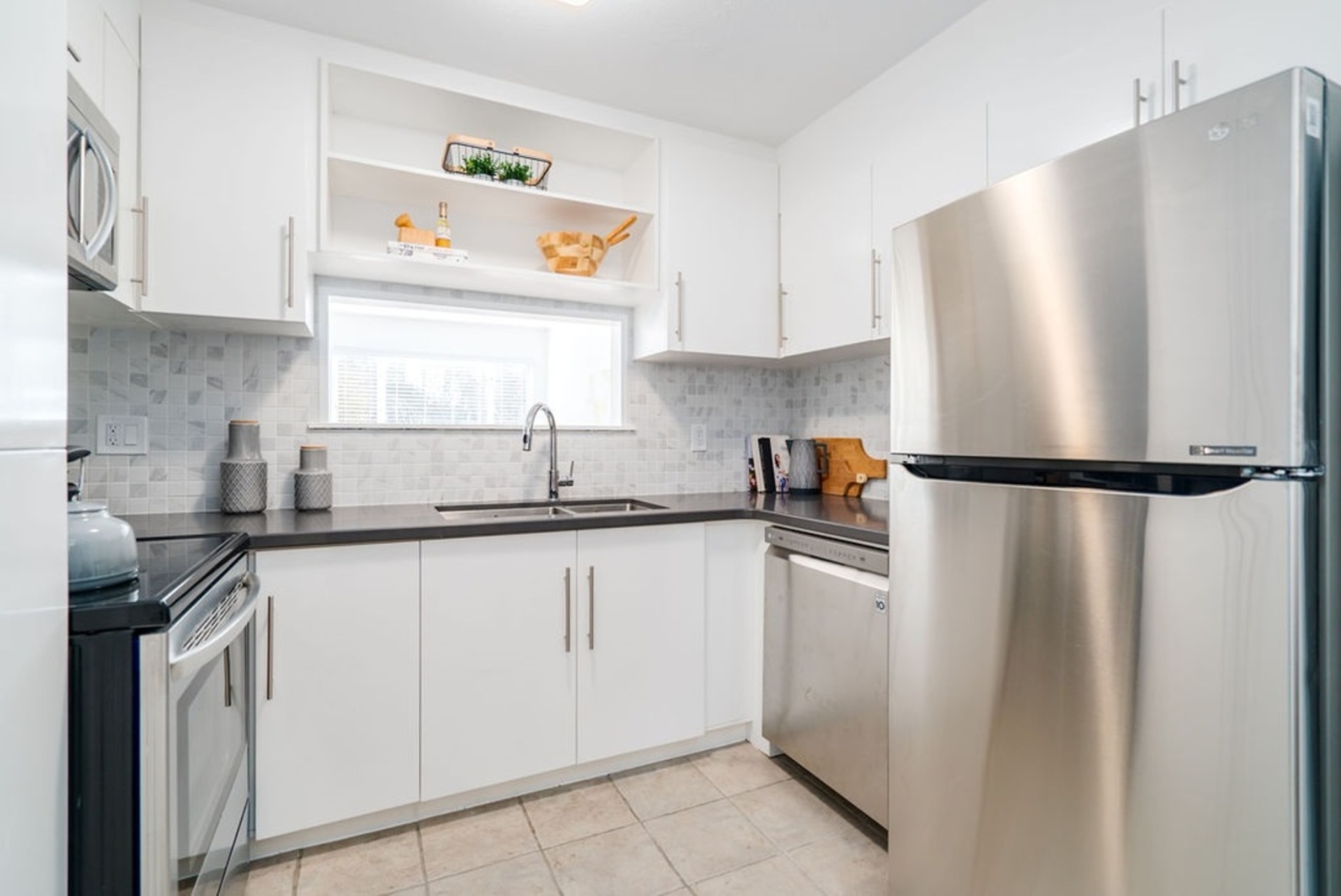 Rarely avail-This oversized 910 sqft. 1 bed & den home is located in one of the most culturally rich & authentic neighbourhoods just blocks from Commercial Drive. Freshly renovated w/ a brand new kitchen & bath, the contemporary faucets, sinks, grey quartz counters & solid wood cabinets provide a sense of design continuity throughout the home. Open the stylish hanging barn door into a spacious master, large enough for a king, complete with your own walk-in closet. The den area encourages creativity with an abundance of natural light pouring through the sunroom skylights. Additional features include new hunter Douglas blinds, new appliances, gas f/p, a unique servery kitchen window, parking & storage. Only a 5 minute drive dt & steps to one of the best & most colourful streets in the city!
