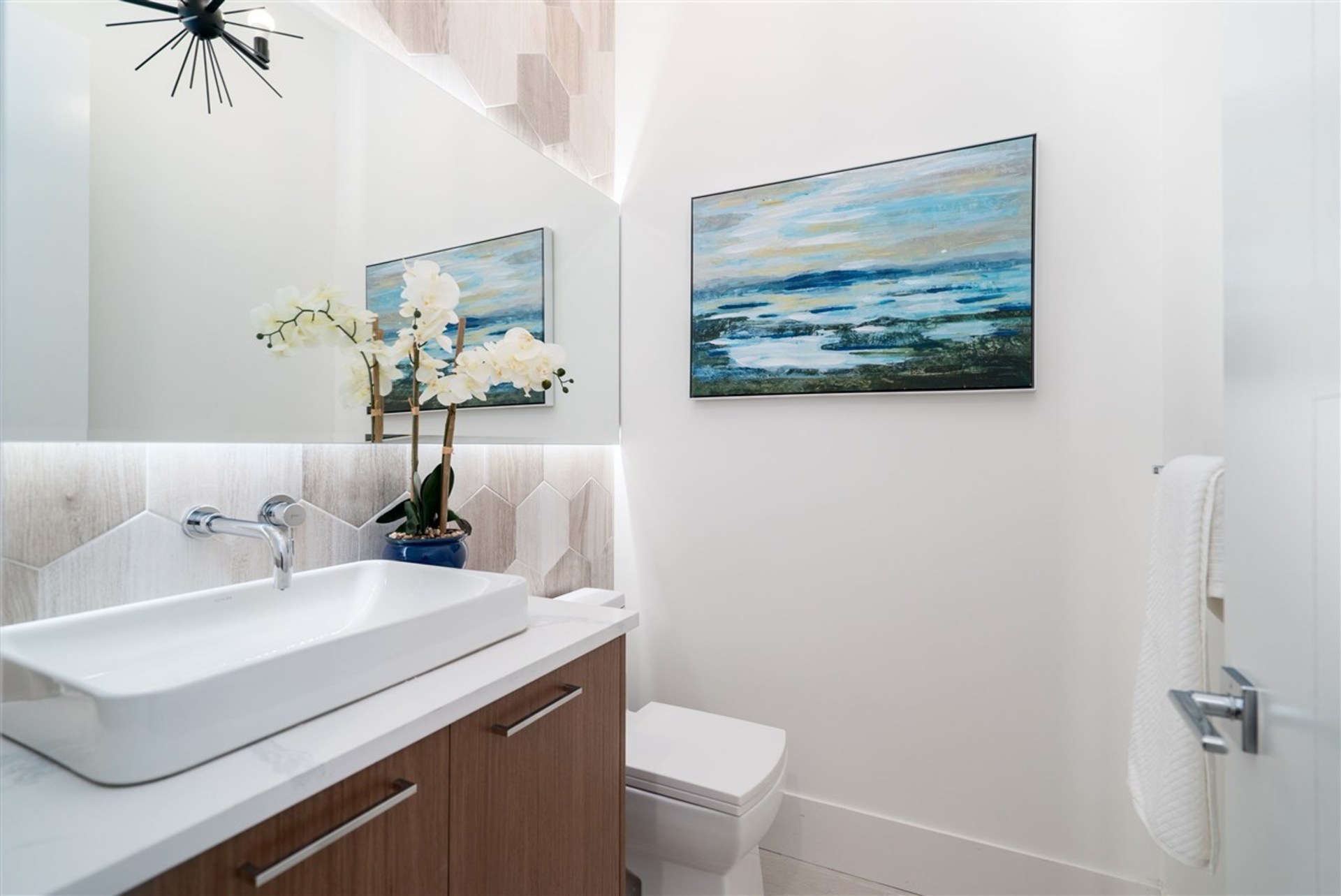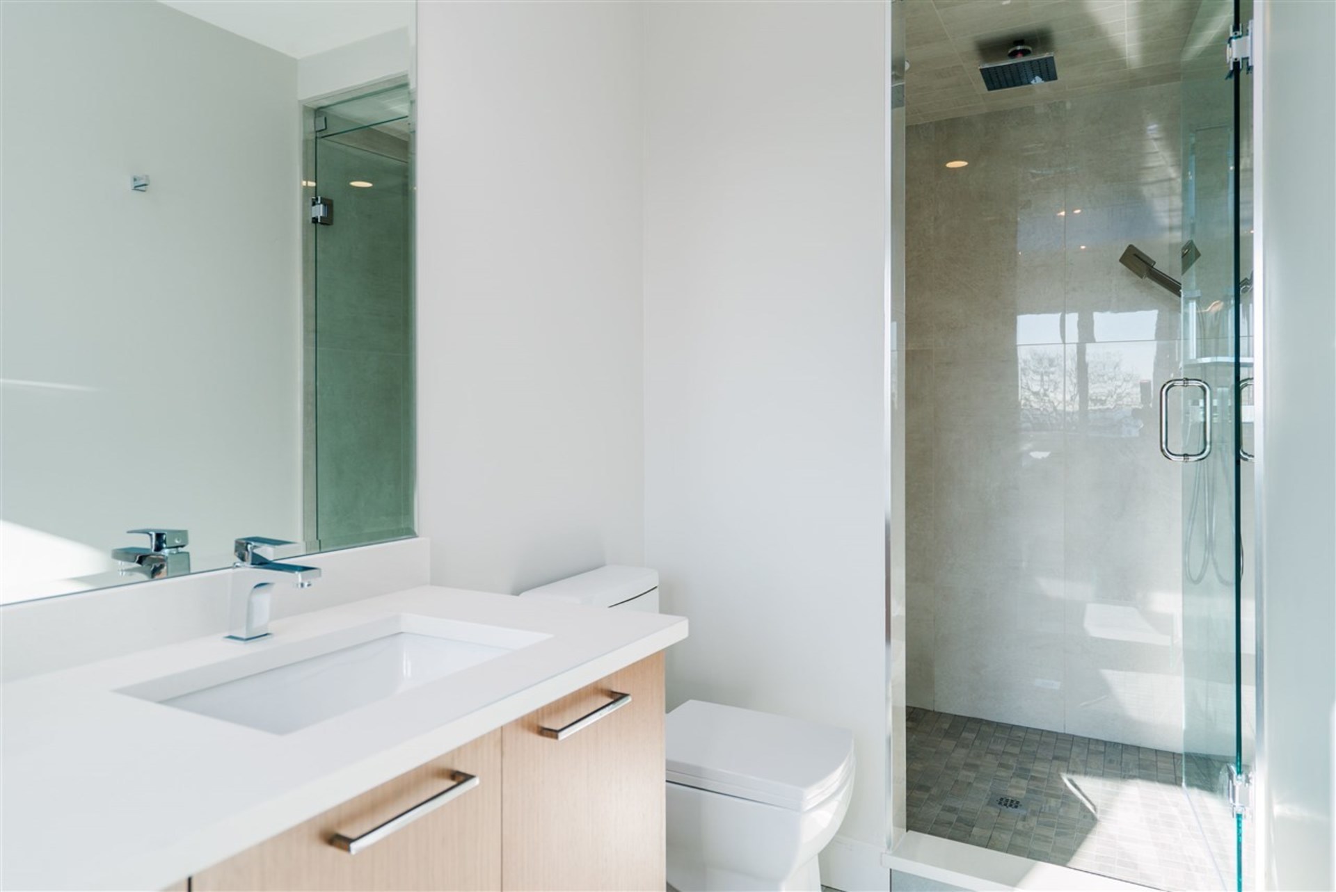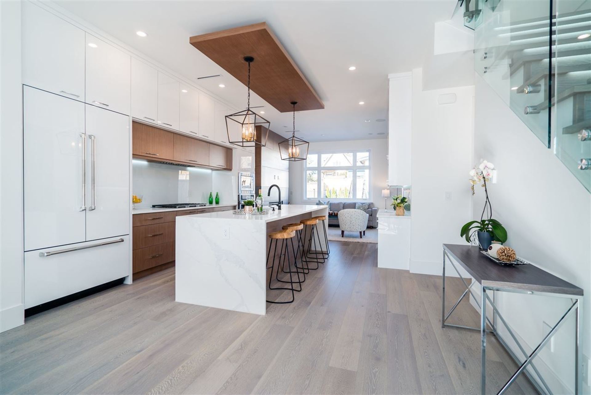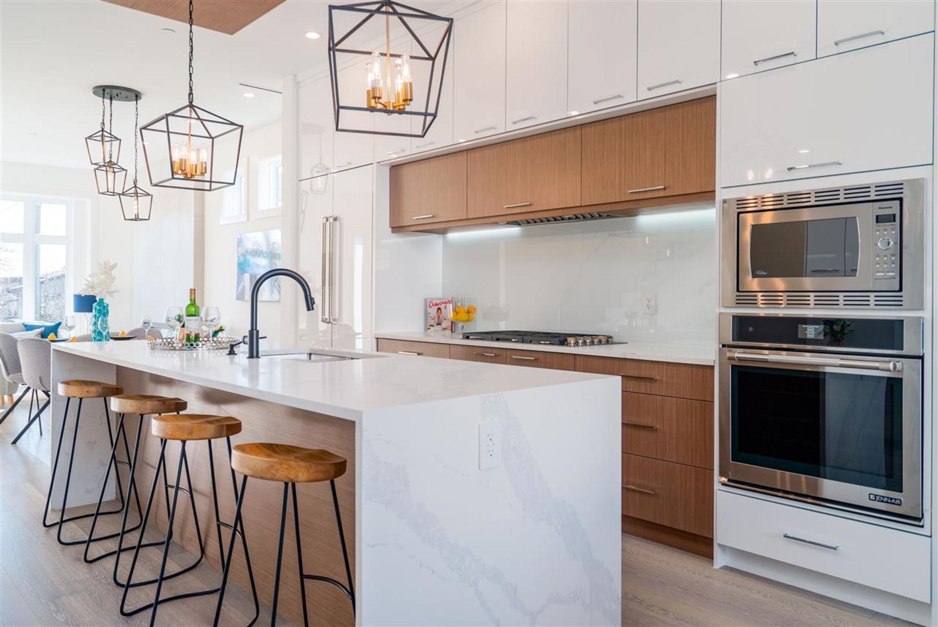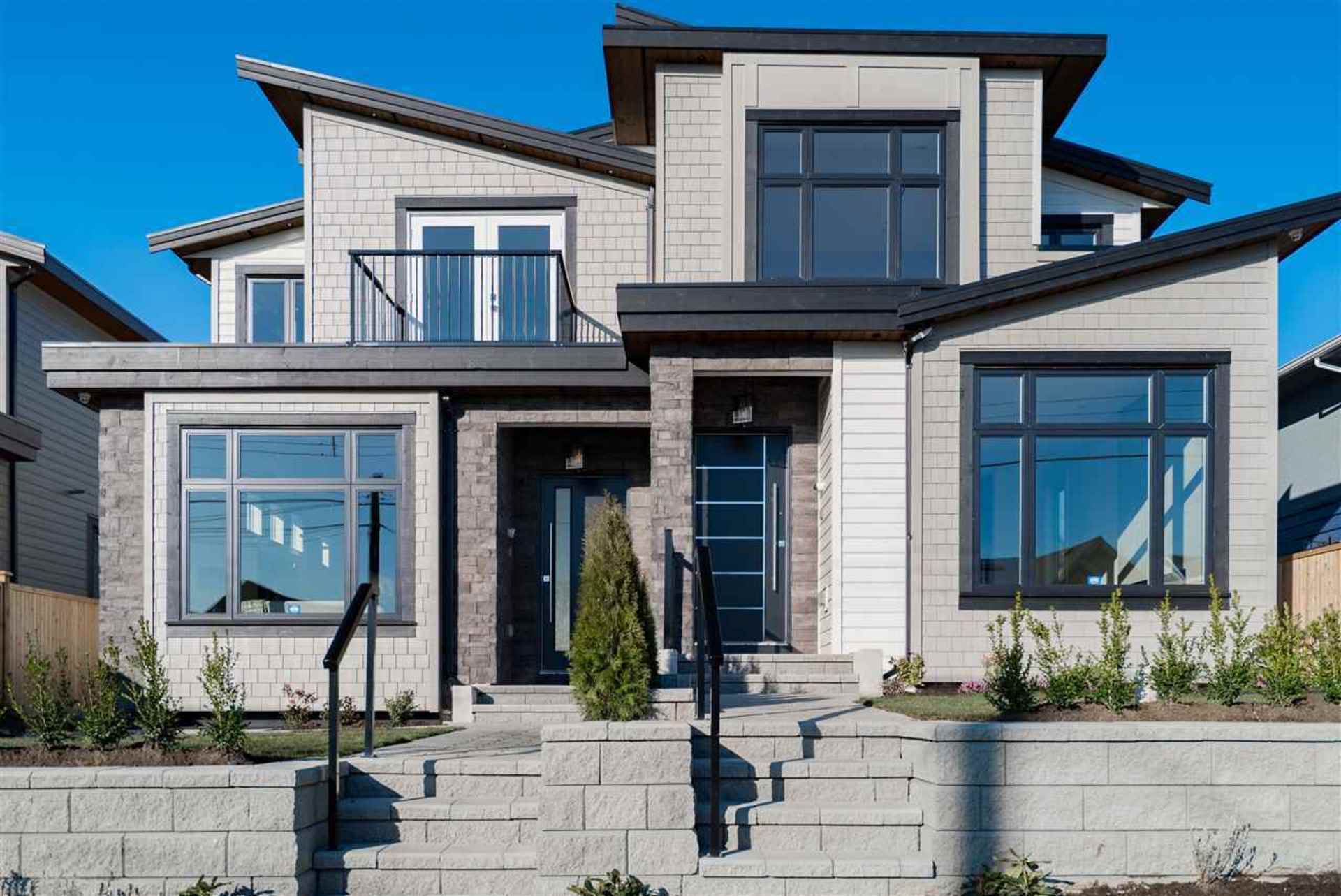 These brand new, architecturally designed, 3-level duplexes are located in the heart of Central Lonsdale. The gorgeous, 2720sqft, 4 bed, 5 bath, Canada-Place-view-homes include a 1 bedroom suite ideal for rental revenue or for the in-laws. Each unit has a spacious open concept floorplan with living room, kitchen, dining & family room on the main, 3 bed, 2 baths up & a beautiful sky-deck off the master. Vaulted ceilings, high-end integrated appliances, wide plank h/w floors, radiant in-floor heating, AC, HRV, 2 fireplaces, built-in vacuum, security and a fully fenced private yard are what set these homes apart. No expense spared. Ranking at the top of the walk-ability scale, close to everything Central Lonsdale has to offer –parks, Ridgeway school, Whole Foods, banks, restaurants & shops.