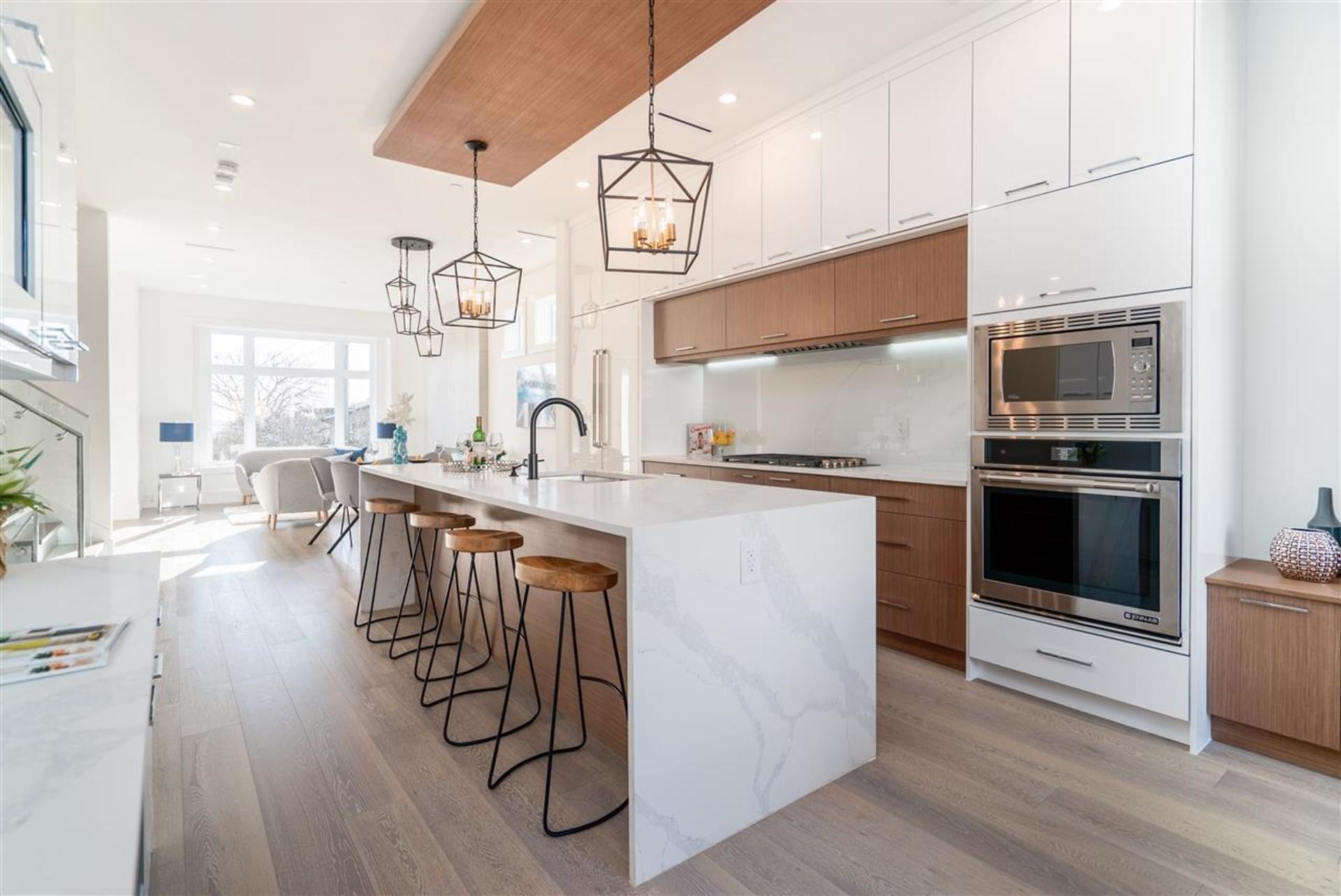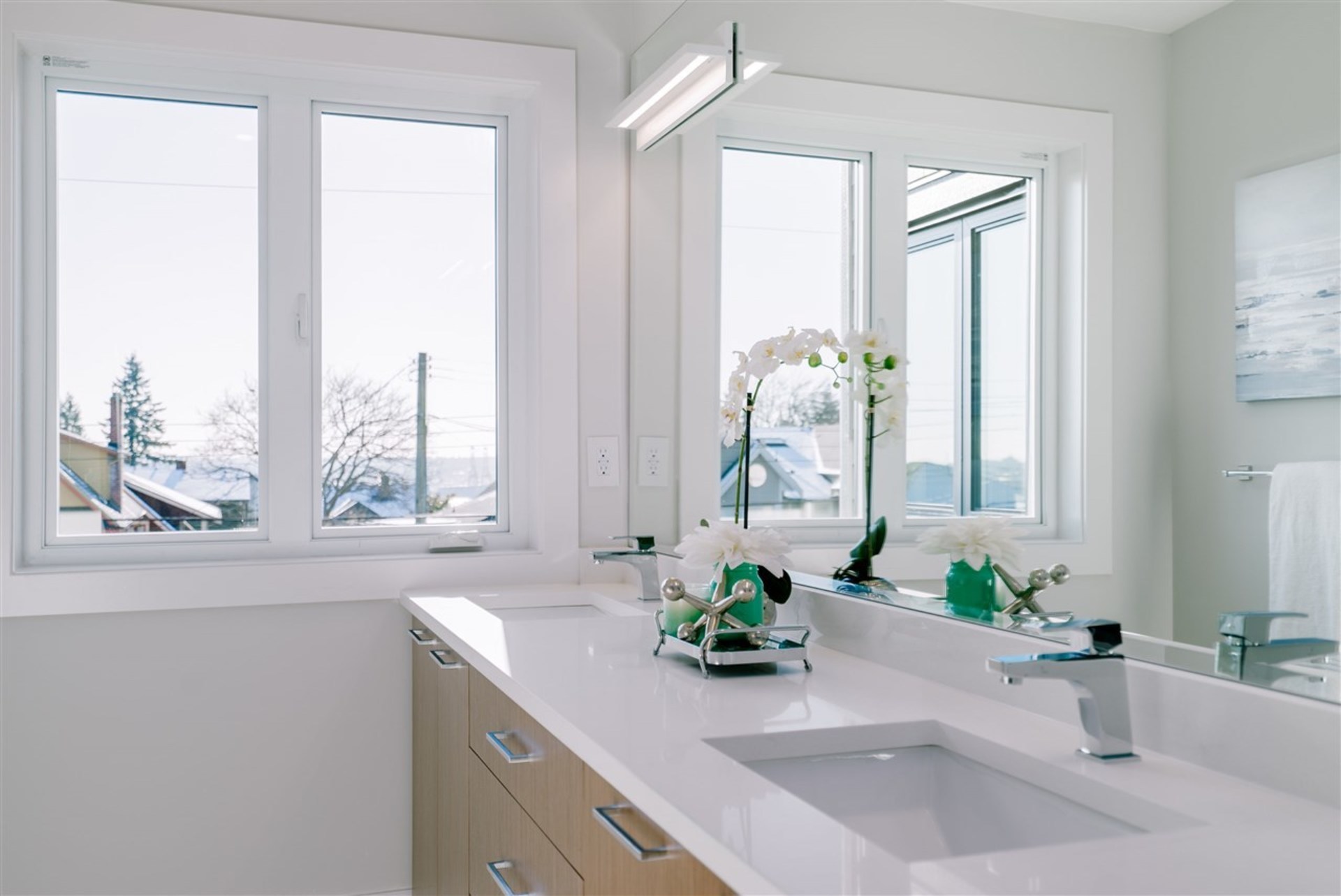 Corner unit! These brand new, architecturally designed, 3-level duplexes are located in the heart of Central Lonsdale. The gorgeous, 2720sqft, 4 bed, 5 bath, Canada-Place-view-homes include a 1 bedroom suite ideal for rental revenue or for the in-laws. Each unit has a spacious open concept floorplan with living room, kitchen, dining & family room on the main, 3 bed, 2 baths up & a deck off the master. Vaulted ceilings, high-end integrated appliances, wide plank h/w floors, radiant in-floor heating, AC, HRV, 2 fireplaces, built-in vacuum, security and a fully fenced private yard are what set these homes apart. No expense spared. Ranking at the top of the walk-ability scale, close to everything Central Lonsdale has to offer –parks, Ridgeway school, Whole Foods, banks, restaurants & shops.