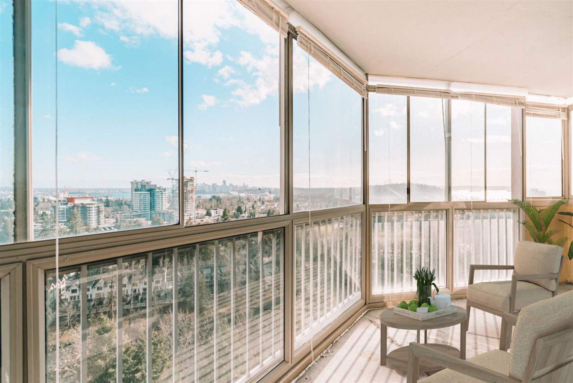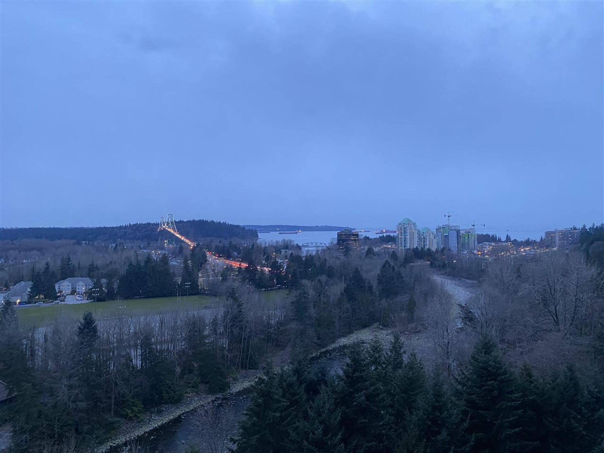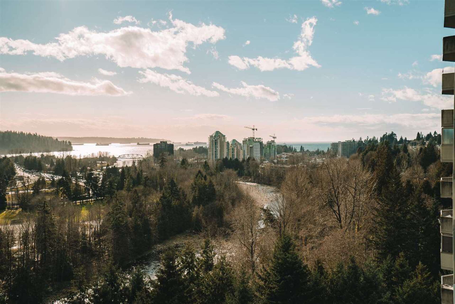 A rare find! This southeast facing, 1113 sqft., 2 bed, 2 bath concrete home in the beautiful gated community of Woodcroft offers panoramic ocean views from Vancouver Island out to UBC, & from Burrard Inlet to Grouse Mountain. Take in the revitalizing flow of the Capilano river while overlooking the tree tops and Lions Gate village from this bright & airy sanctuary in the sky. The spacious & functional layout will allow you to customize & update at a minimal cost. Features include an enclosed balcony, master walk-in closet, oversized in-suite storage, classic galley kitchen, large living area, parking & storage locker. This mini-resort offers 24/7 security & is surrounded by lush landscaped garden areas. Amenities include pool, hot tub, exercise room, etc. Easy Access to Lions gate bridge.