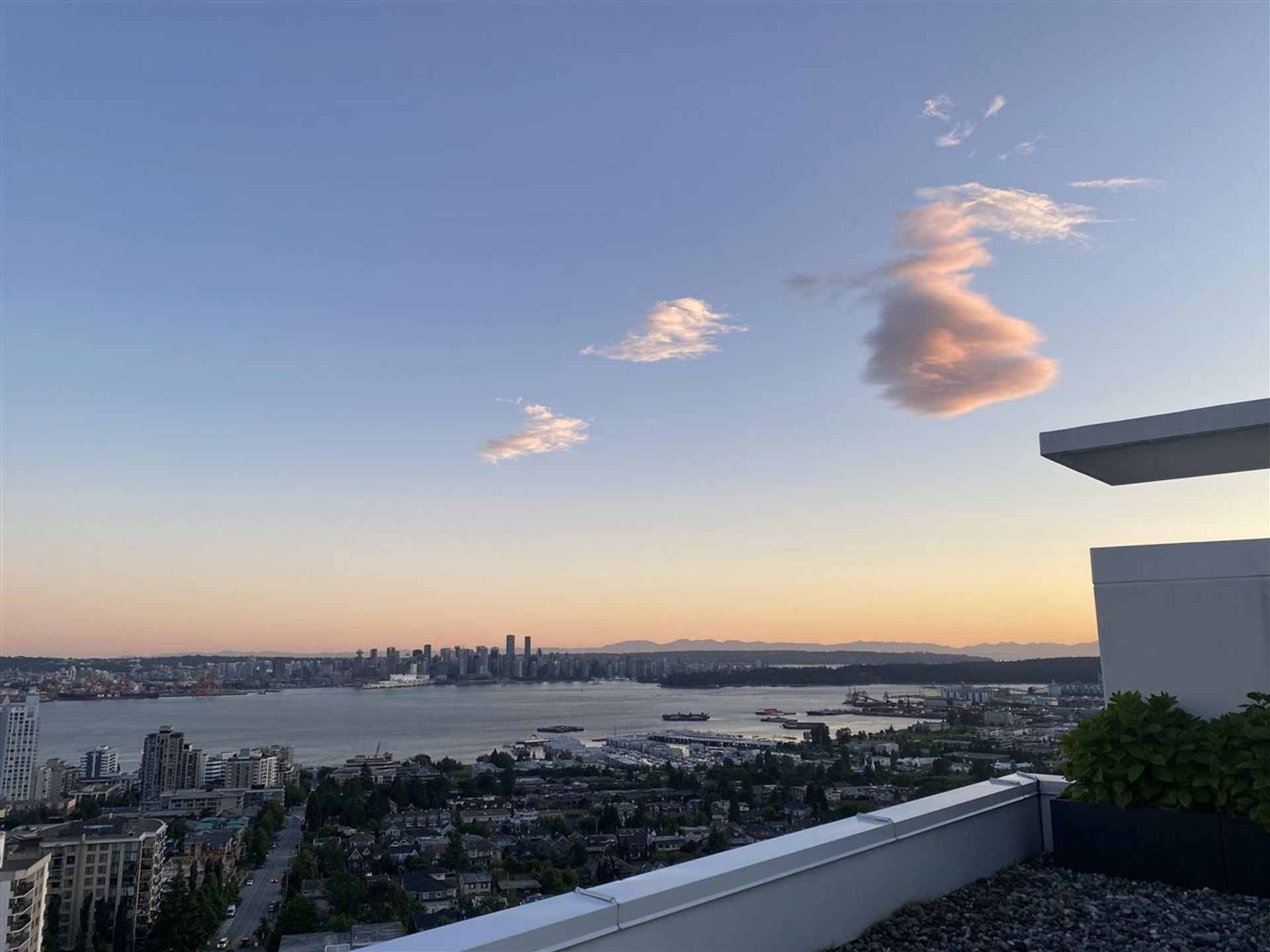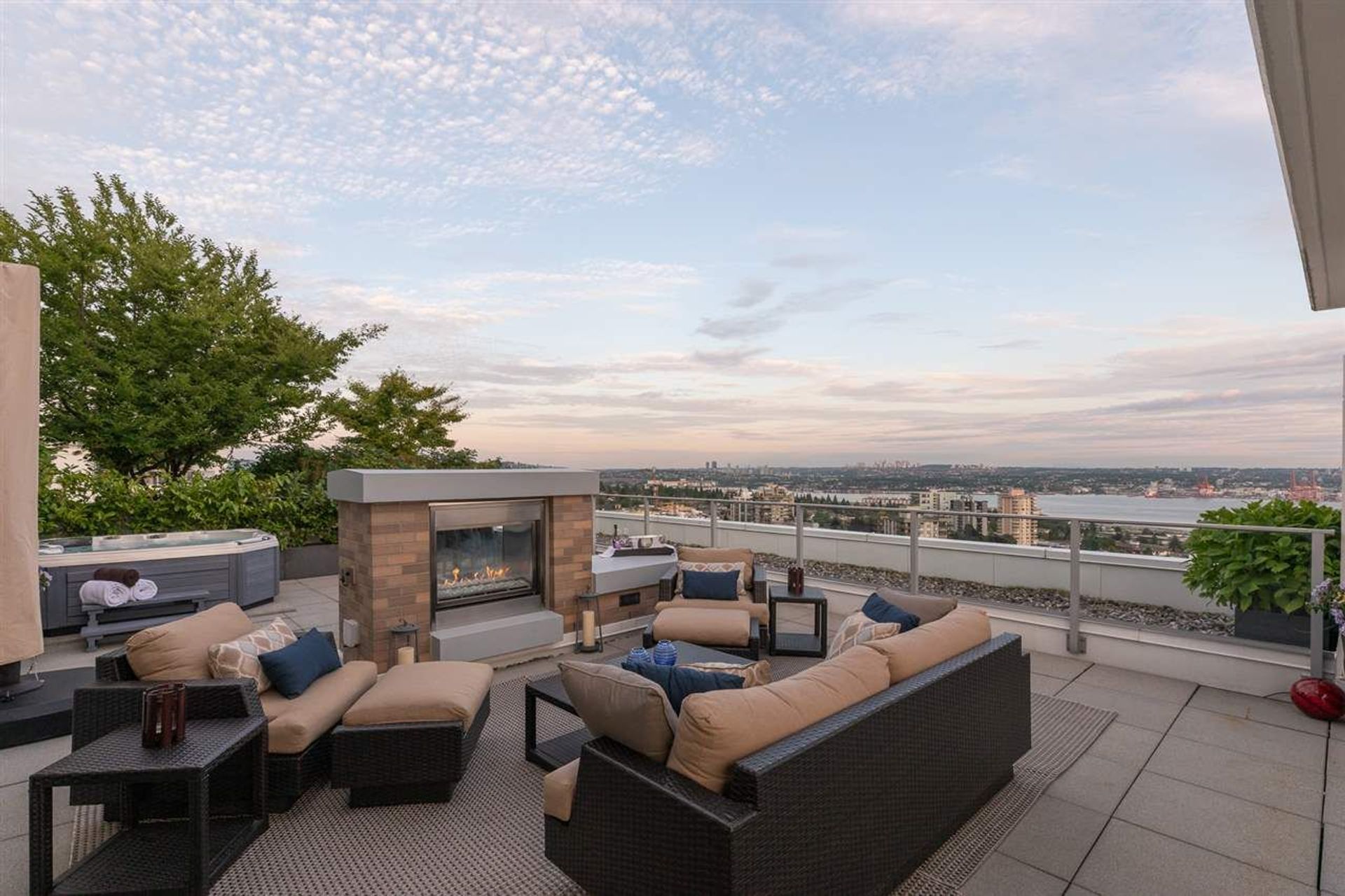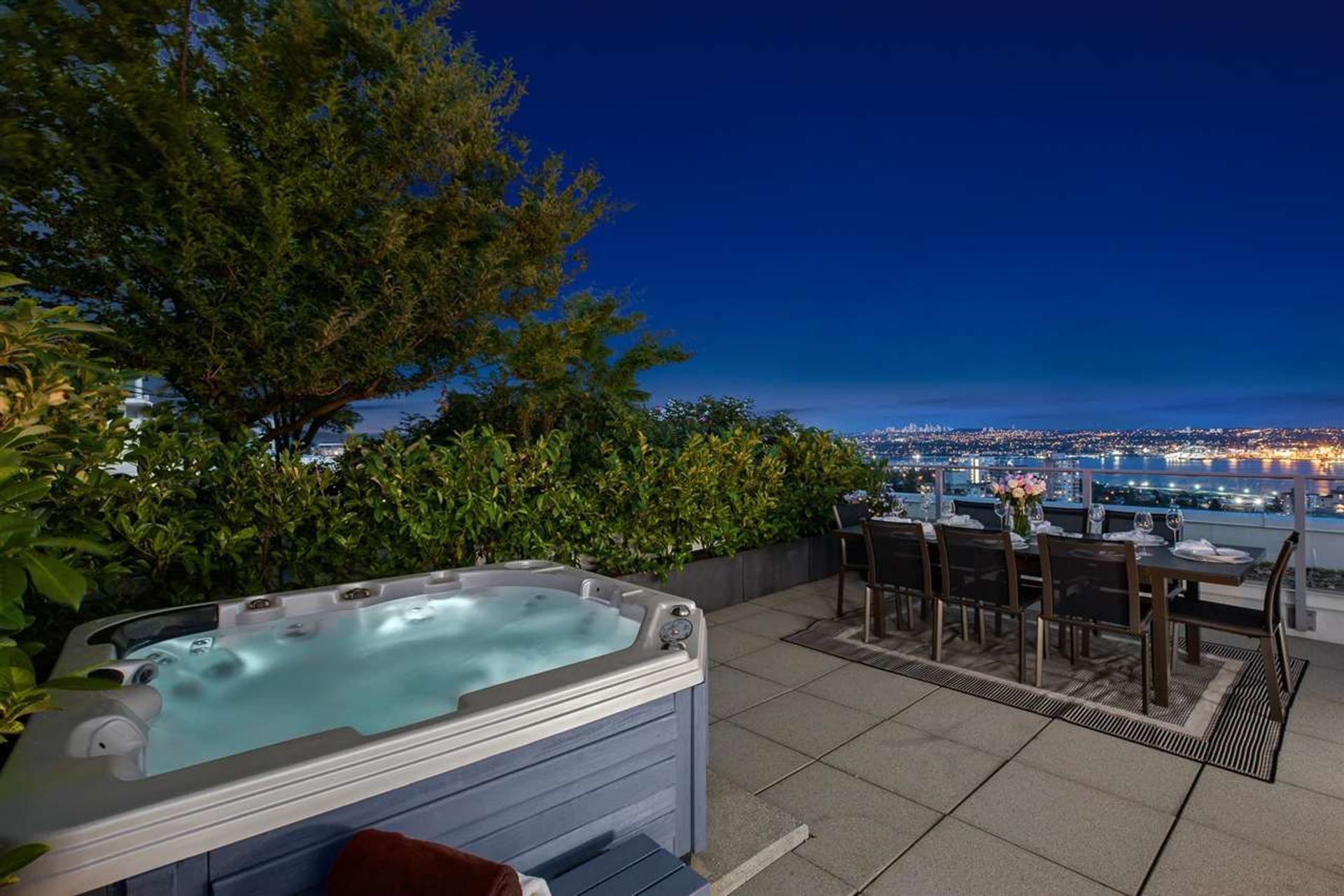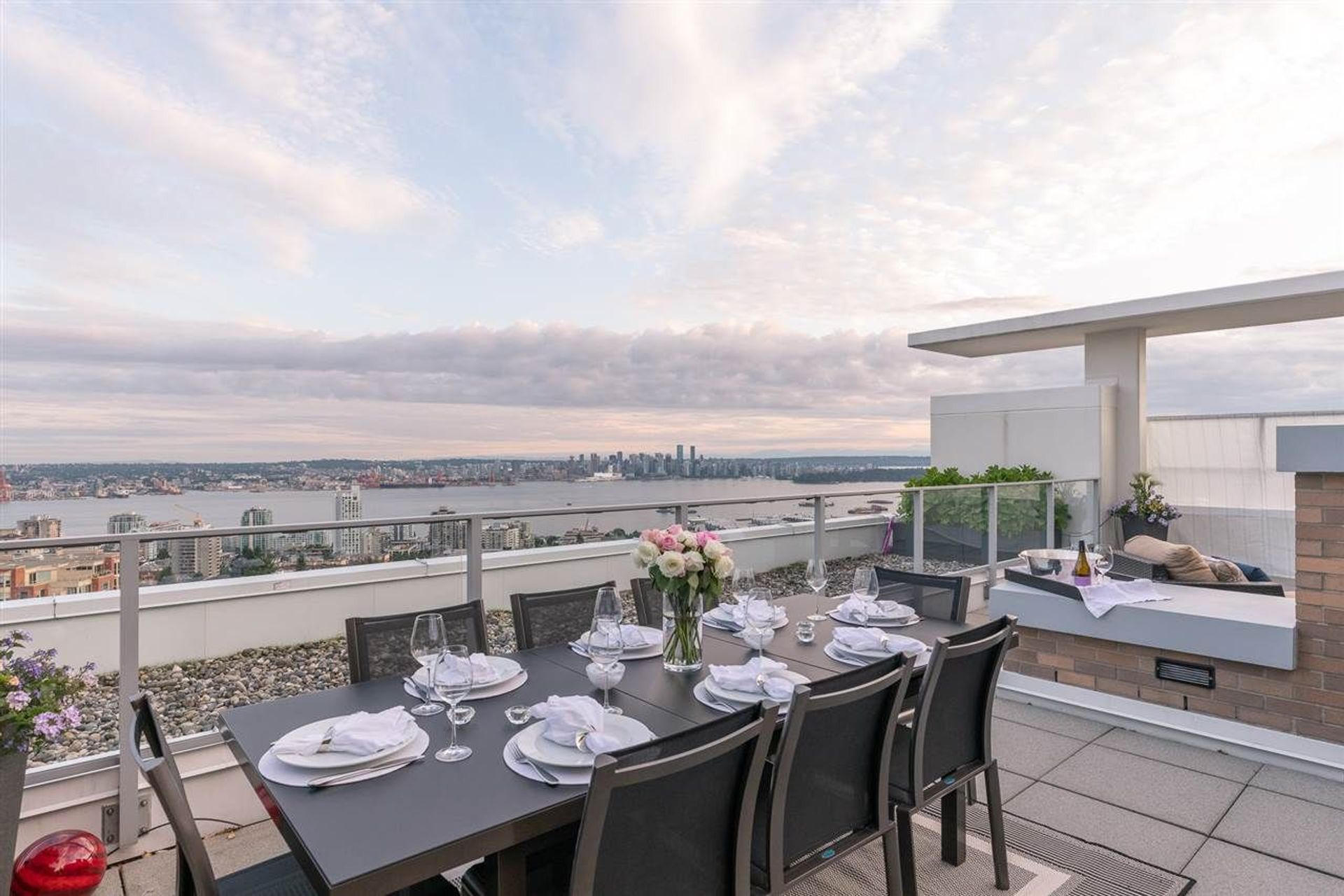 This one-of-a-kind, penthouse w/ unobstructed panoramic views of the city & harbour, is a truly remarkable home. Completely redesigned & renovated to maximize living space, this 2 bed + den, 3 bath residence is the perfect pairing of style & functionality. The gourmet kitchen is a showstopper w/ floor to ceiling custom cabinetry, Subzero, Wolf & Miele appliances & an oversized island. The main bed includes walk-in closet & spa-inspired ensuite w/ dual sinks. Features include AC, ventless washer/dryer, built-in vac, in-ceiling wine cellar, & pull-out pantry. The 1682sqft interior space extends out to a 930sqft rooftop patio complete w/ gas fireplace, hot tub, gardens. An add. 200sqft covered deck extends the living area. Walking distance to all Central Lonsdale has to offer!