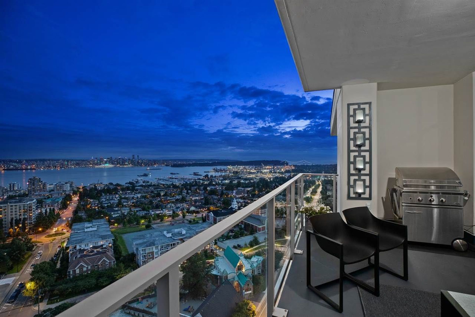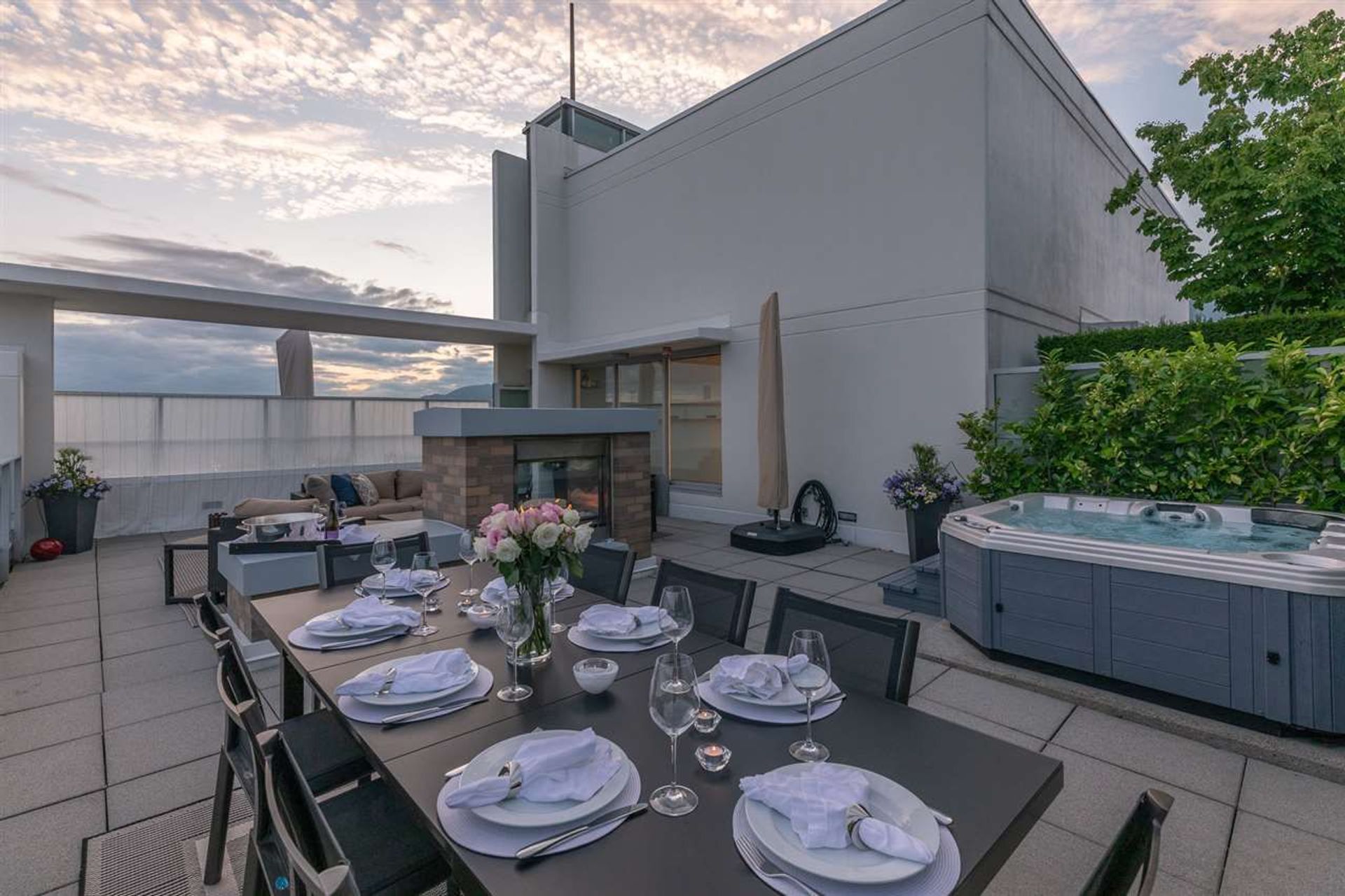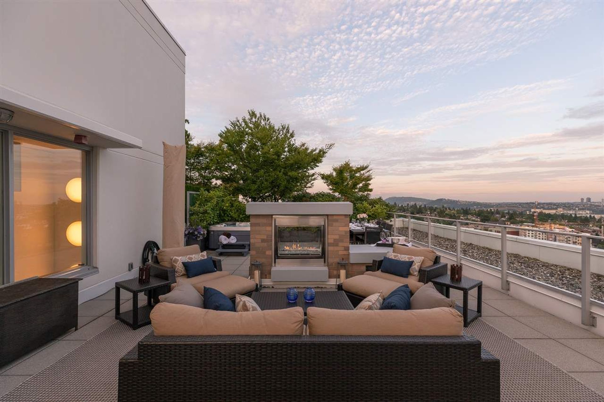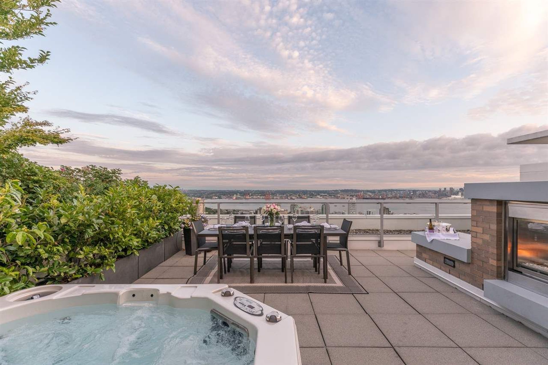 This one-of-a-kind, penthouse w/ unobstructed panoramic views of the city & harbour, is a truly remarkable home. Completely redesigned & renovated to maximize living space, this 2 bed + den, 3 bath residence is the perfect pairing of style & functionality. The gourmet kitchen is a showstopper w/ floor to ceiling custom cabinetry, Subzero, Wolf & Miele appliances & an oversized island. The main bed includes walk-in closet & spa-inspired ensuite w/ dual sinks. Features include AC, ventless washer/dryer, built-in vac, in-ceiling wine cellar, & pull-out pantry. The 1682sqft interior space extends out to a 930sqft rooftop patio complete w/ gas fireplace, hot tub, gardens. An add. 200sqft covered deck extends the living area. Walking distance to all Central Lonsdale has to offer!
